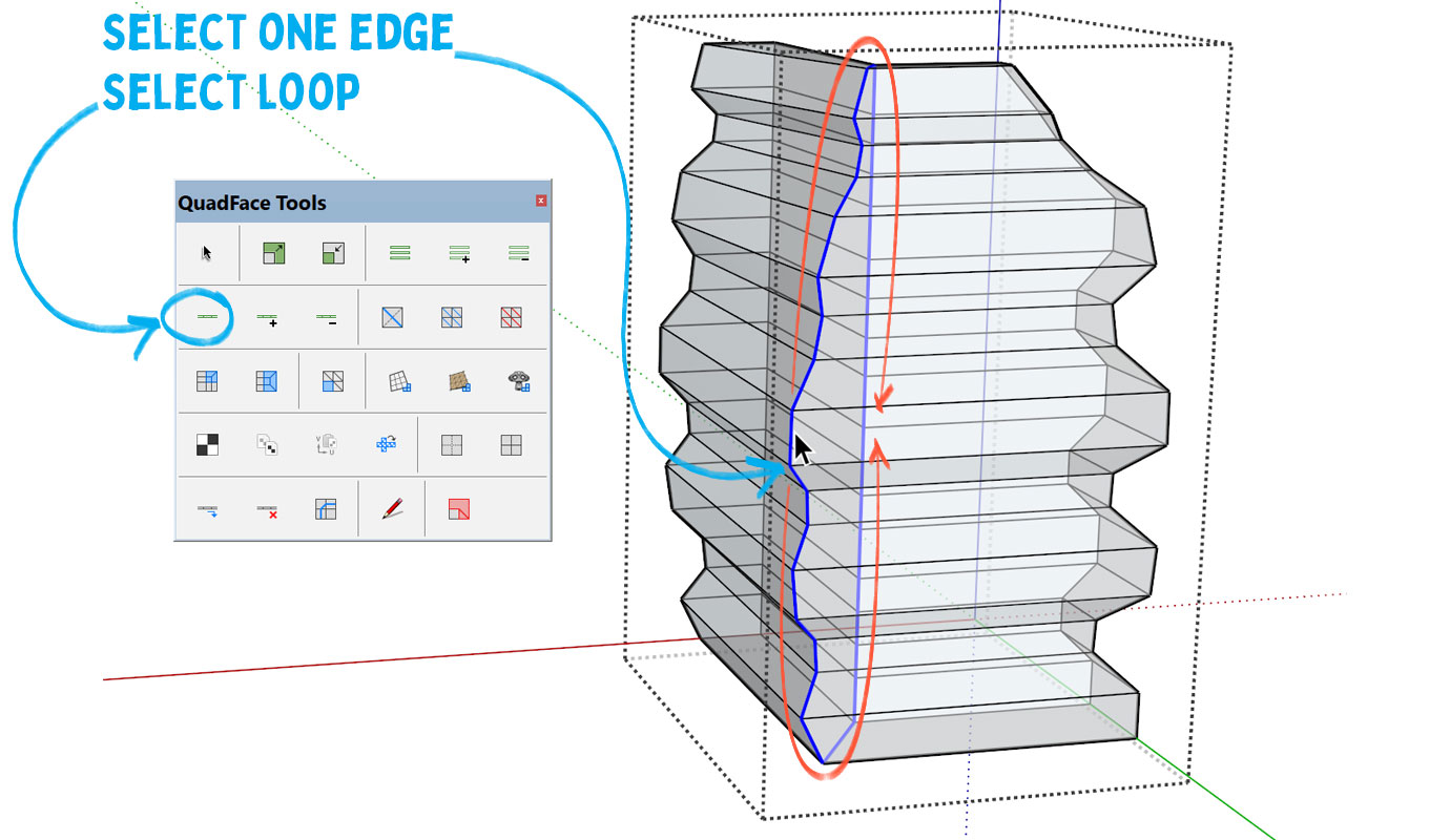 What’s great about QuadFace Tools, is it provides a way to treat soft quads as if they are actually quads. So in SketchUp, if you have a hard-edged quad, divided by a soft edge, you can still use QuadFace tools on them as if they are a real quad. ThomThom, the plugin developer, has a great forum post about this logic on Sketchucation here.